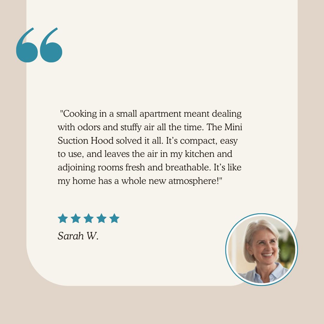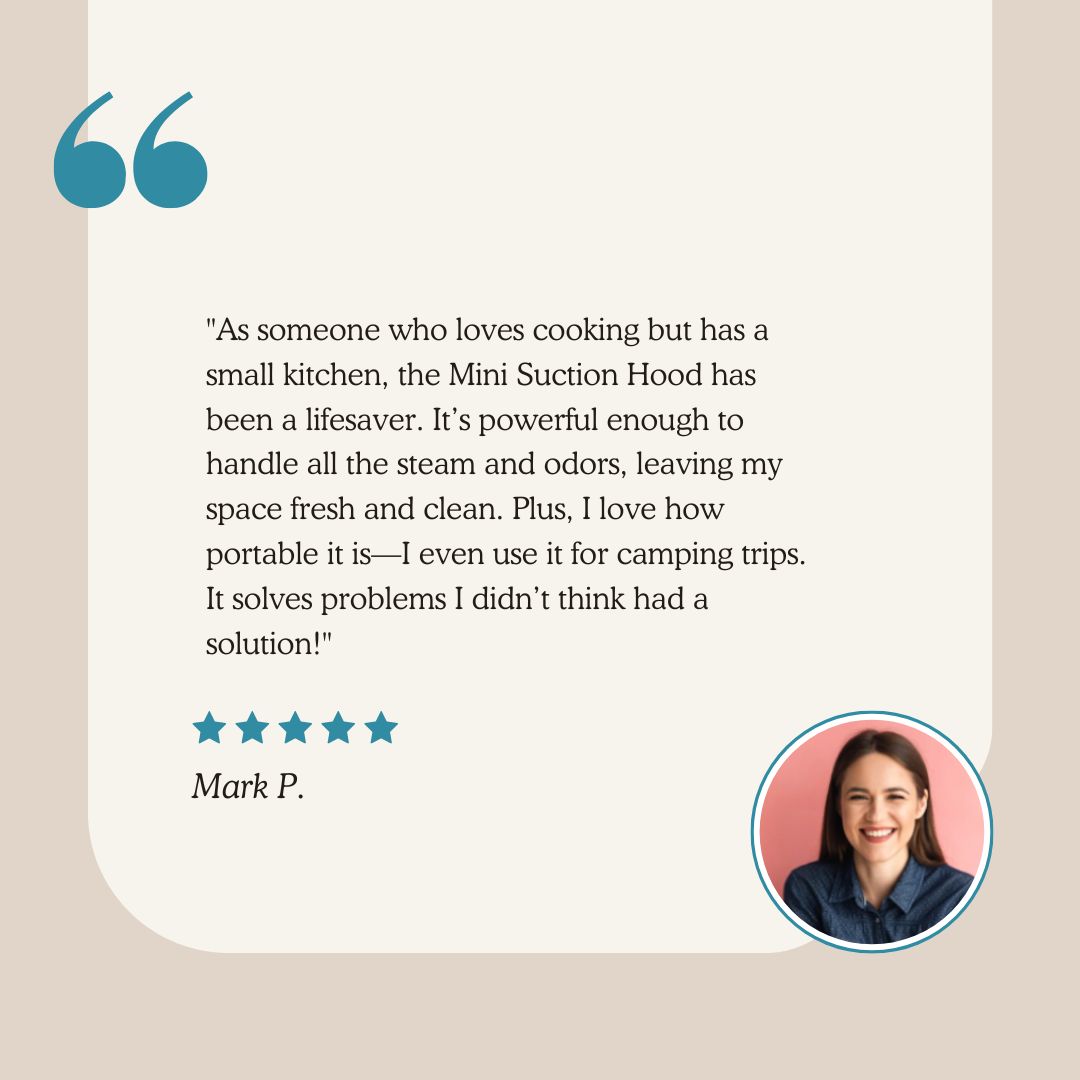 "I can’t believe how much of a difference the MiniAir Suction Hood has made in my life! Cooking in my small kitchen used to be such a hassle—smoke, steam, and lingering smells would take over the entire space. But with this compact and portable extractor, everything stays fresh and breathable. It’s so easy to use—just plug it in, adjust the angle, and it works like magic! I even take it on camping trips, and it handles smoke from the grill effortlessly. No bulky installations, no mess—just clean, fresh air wherever I go. I honestly don’t know how I lived without it!" – Jessica M.
